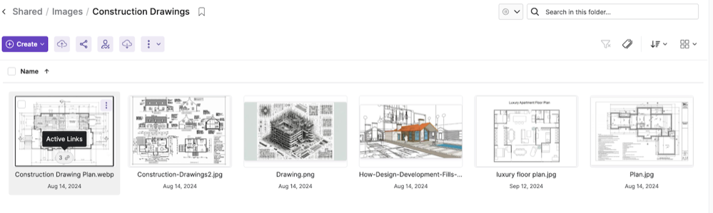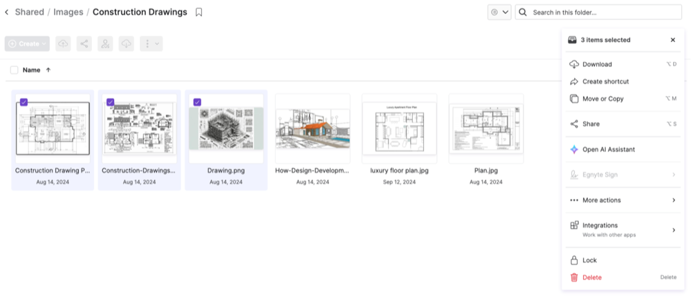 The large icons (Gallery view) in the Web UI now feature an enhanced grid layout, richer inline actions when hovering over a selection, and a more intuitive browsing experience overall. Users can hover over a file to view inline status indicators such as active links, versions, comments, lock, and insights. They can also access the context menu through the three-dot menu or by selecting files, resulting in a cleaner interface and enabling easier collaboration.