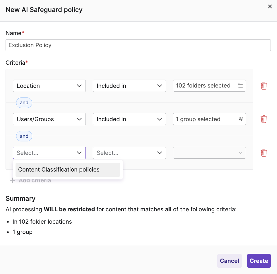 - User Access: Admins can restrict which users and groups have access to AI-powered functionalities. This is useful for restricted AI rollouts and for the permanent exclusion of specific groups who don’t need to utilize AI functionality.